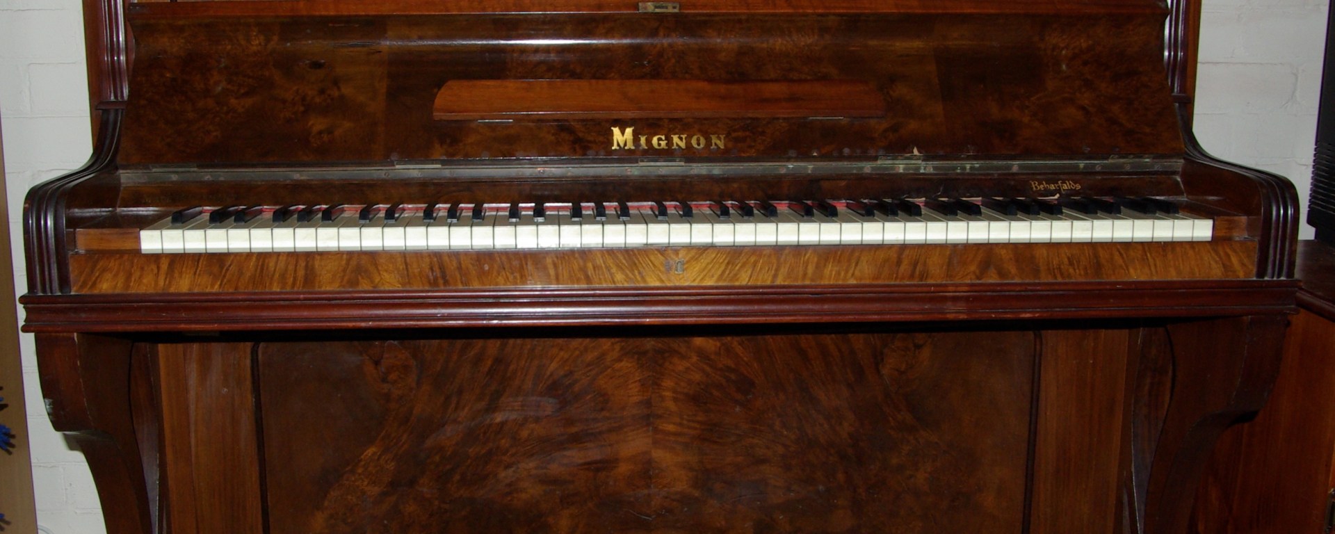 It was common practice in the late nineteenth and early twentieth centuries for Australian companies to import pianos from Germany and apply a trade name, such as Mignon, before piano factories in Australia became more widespread. The words Made in Germany are printed on the nameboard rail on the Mignon. This is a significant and important historical fact to document because B. Bebarfald & Co. Ltd. has not existed in the Sydney area since 1973 and the store itself is now a part of history. The focus for an interesting story could be a history of German-made pianos commissioned and imported into Australia.